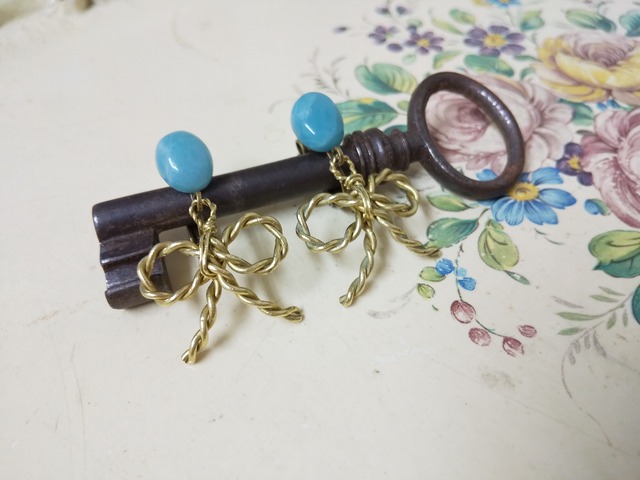 大人のリボンイヤリング 真鍮リボン×天然石(アマゾナイト)