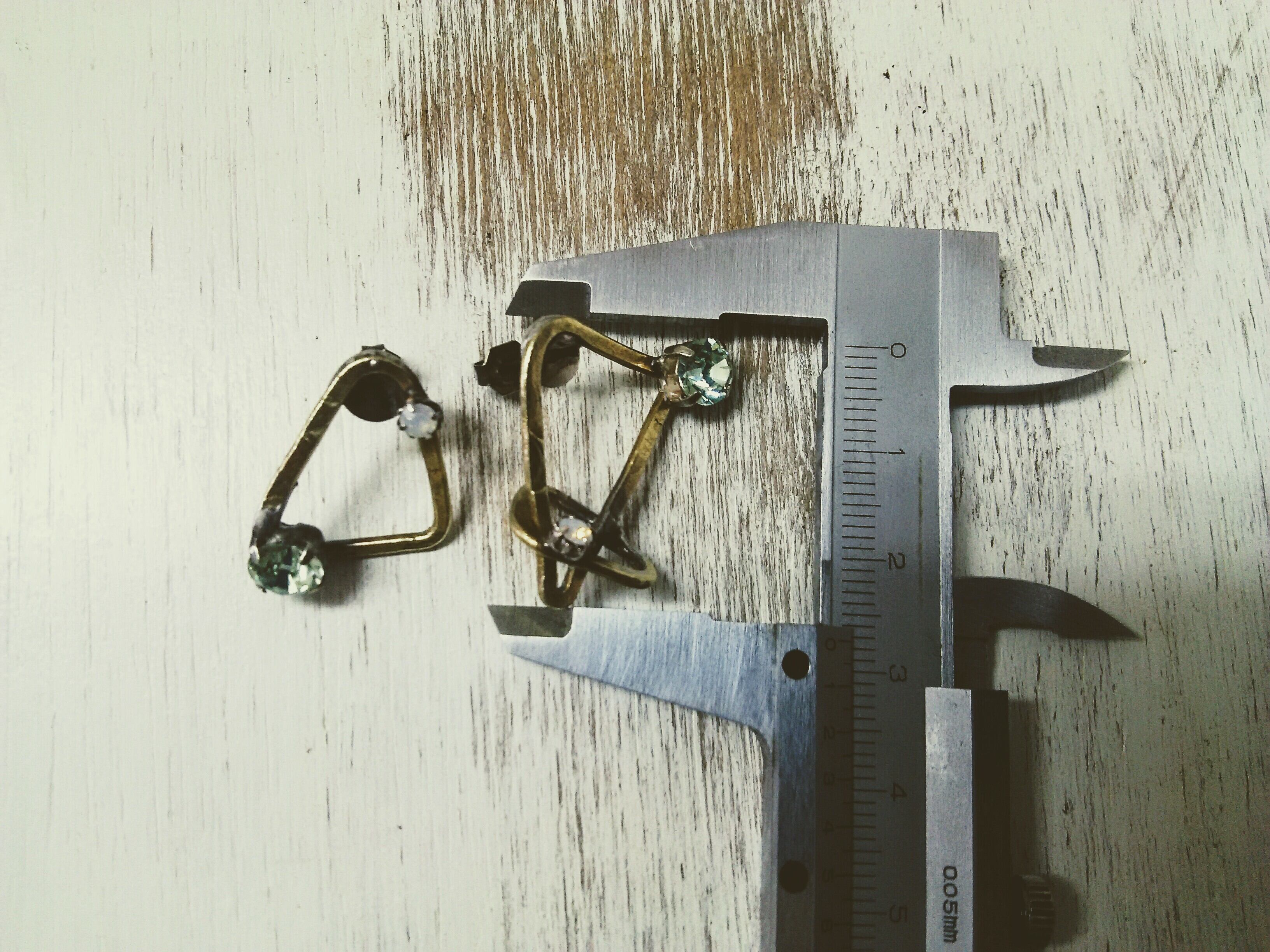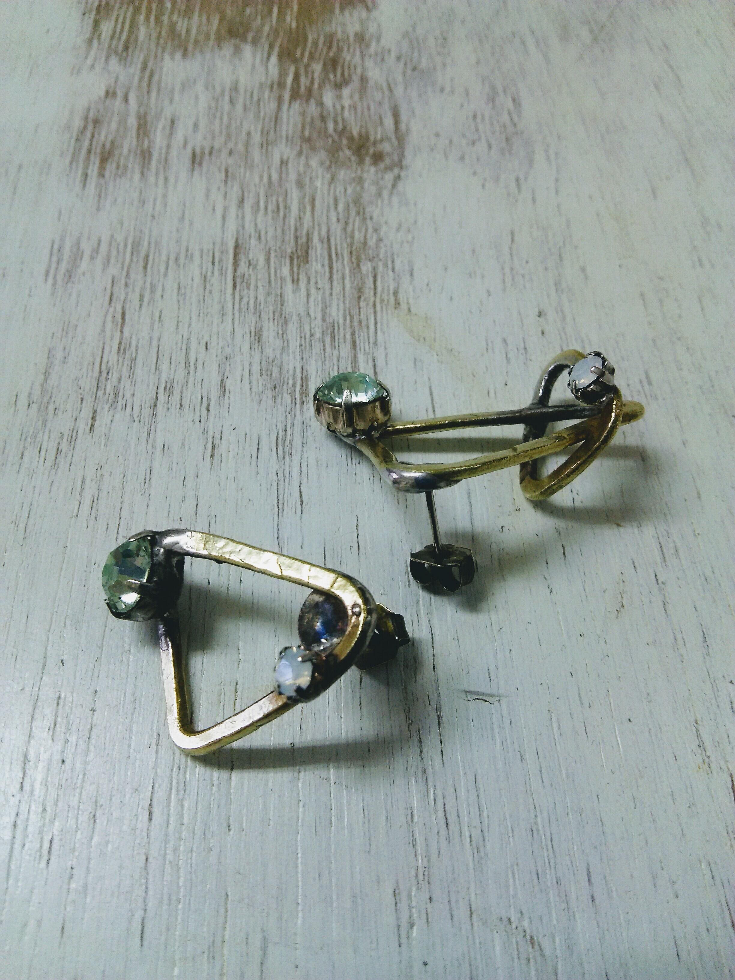 真鍮線で三角モチーフを作りスワロフスキー社のラインストーン(クリソライトとホワイトオパール)を半だ付けしました。