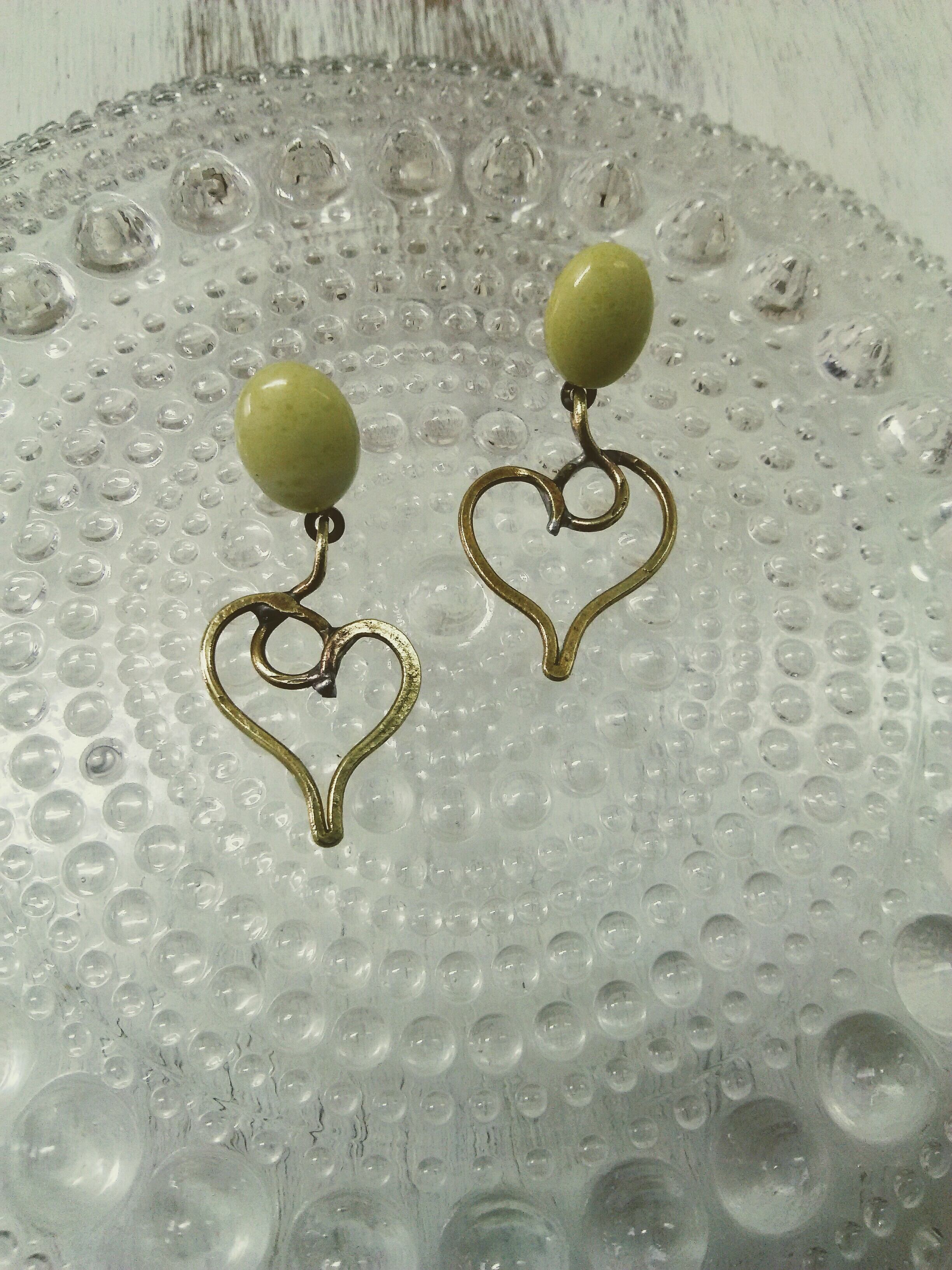 天然石のyellow gaditeからハートがぶら下がるデザインのピアスです。