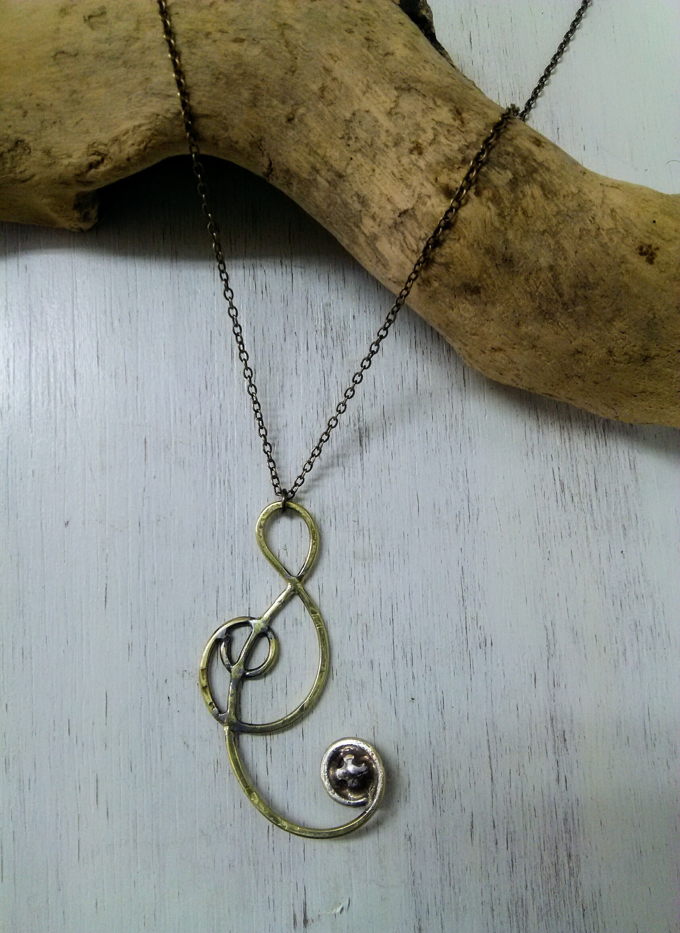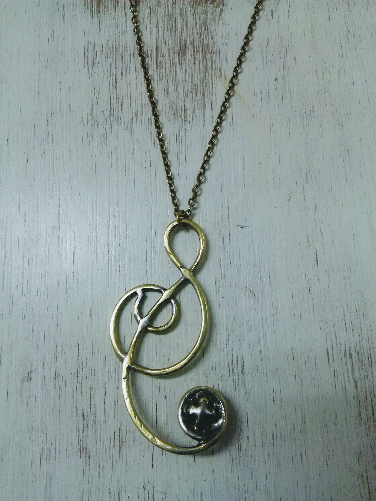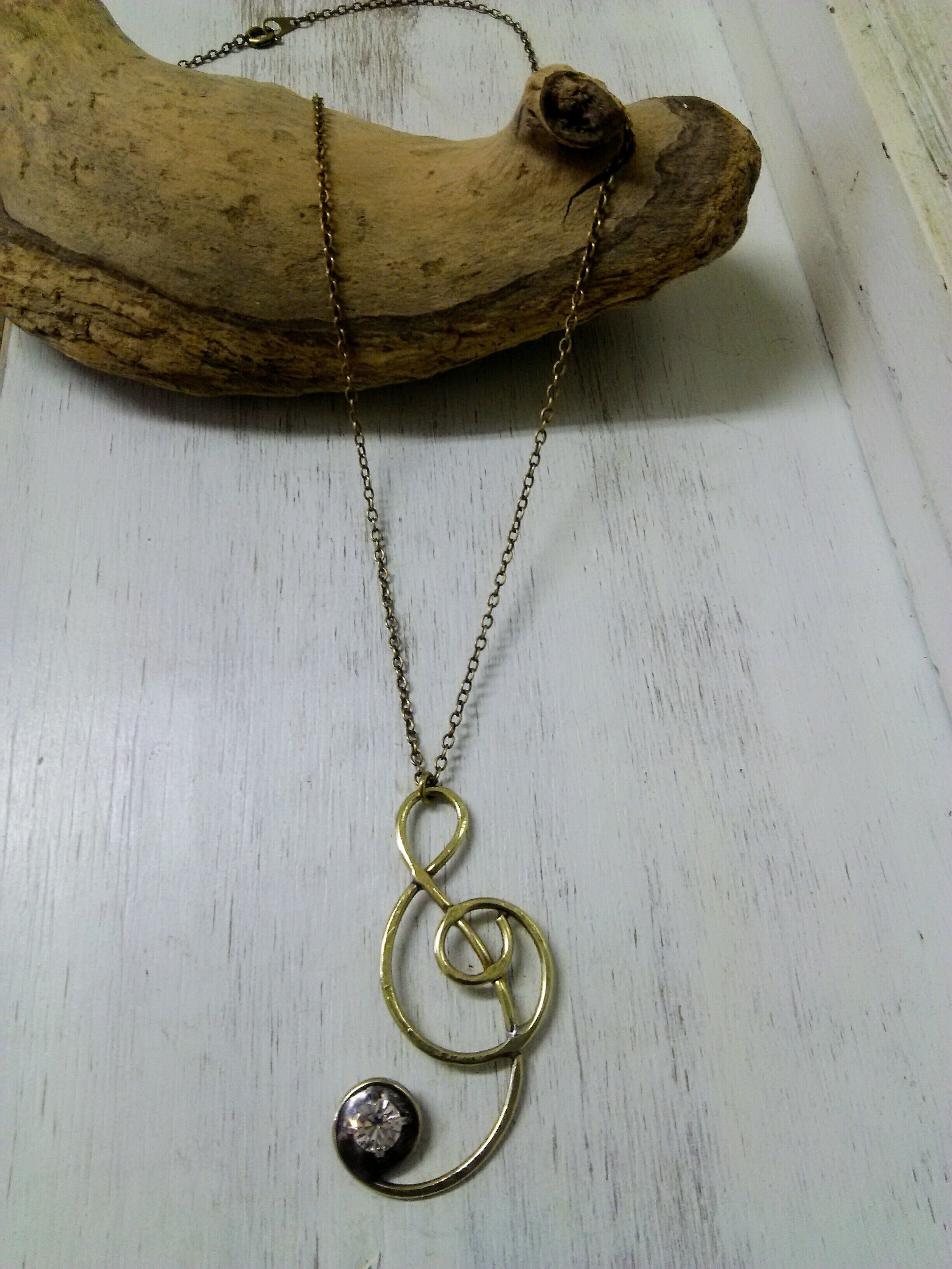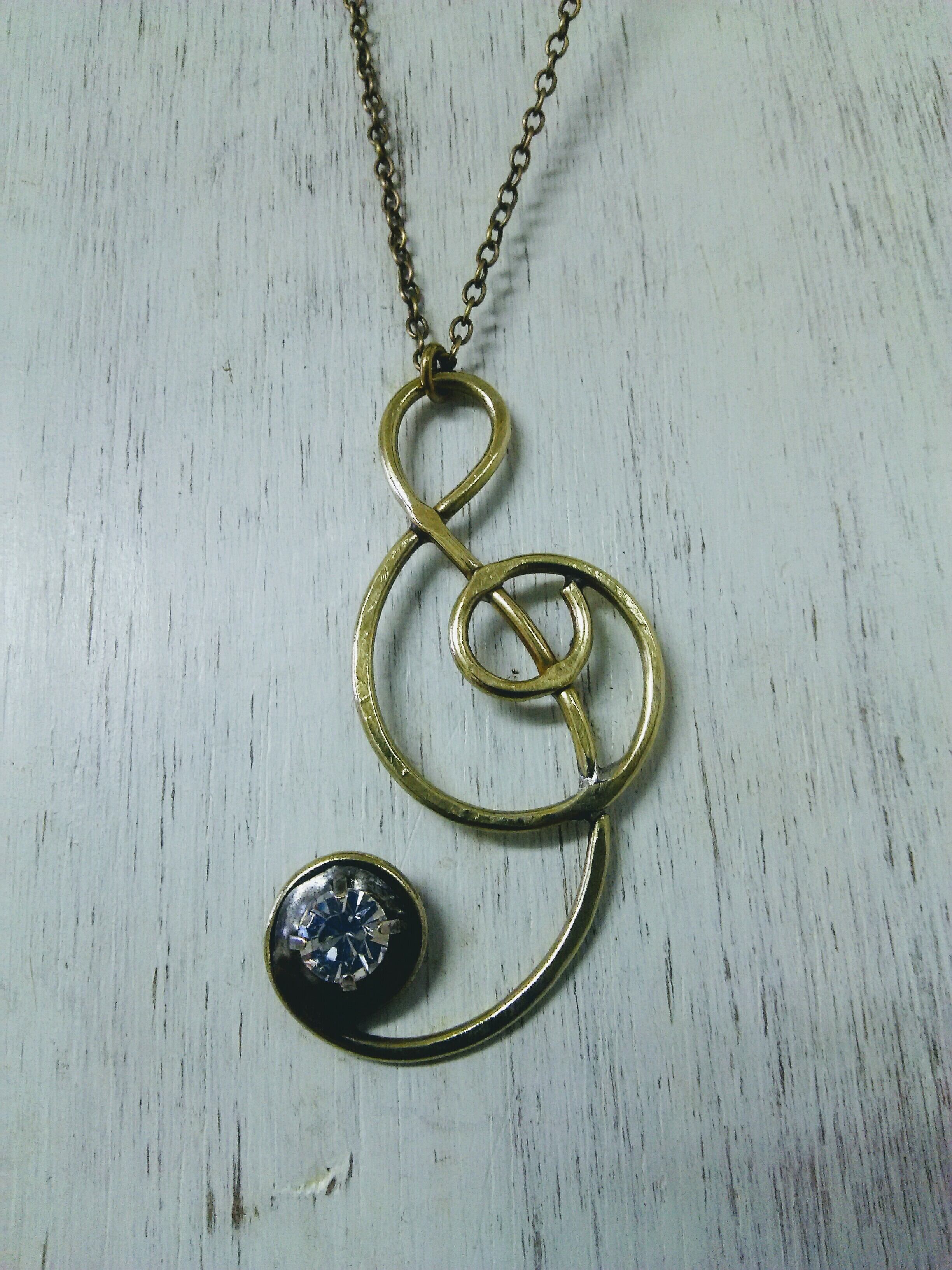 真鍮線でト音記号を作り、スワロフスキーのラインストーン(6ミリ)をはんだ付けしました。