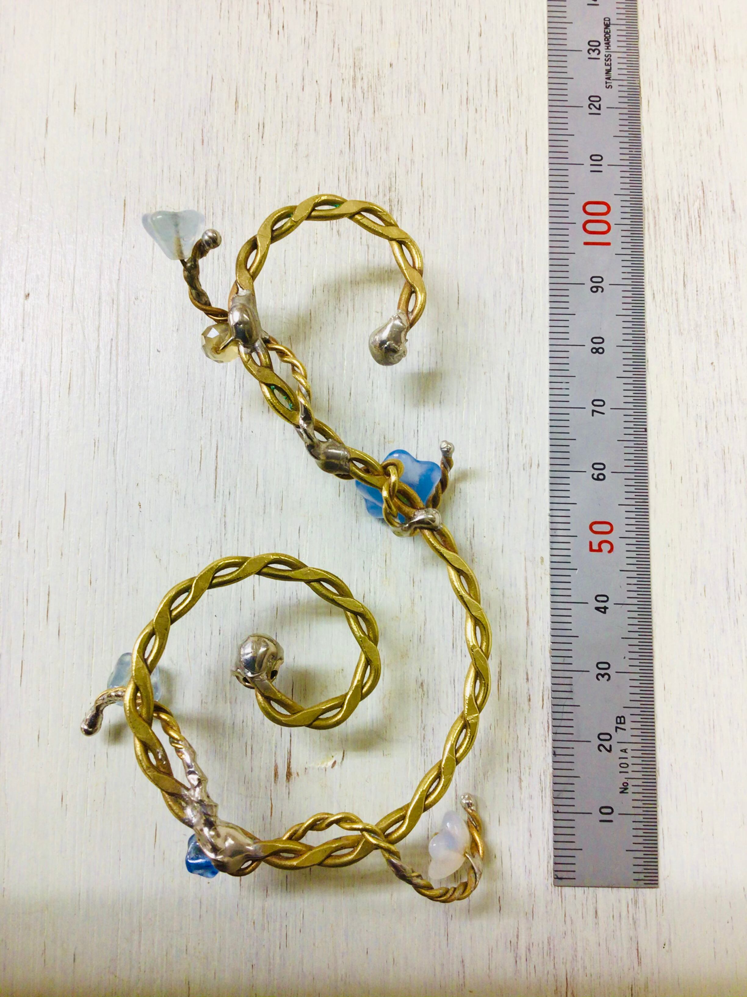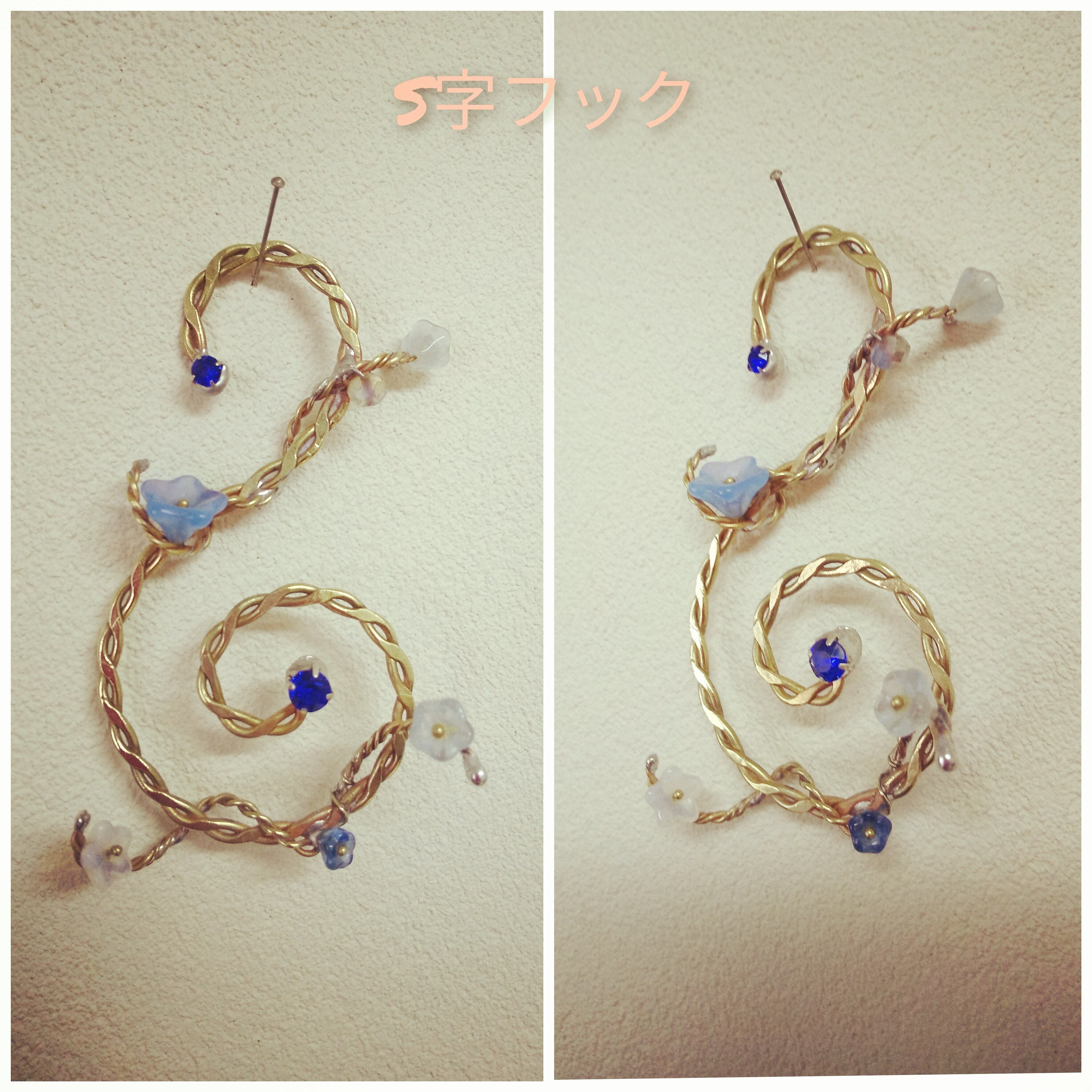 S字の先端にはスワロフスキークリスタルのラインストーンのマジェスティックブルー4mmと6mmをはんだ付けしています。とても鮮やかなブルーです。